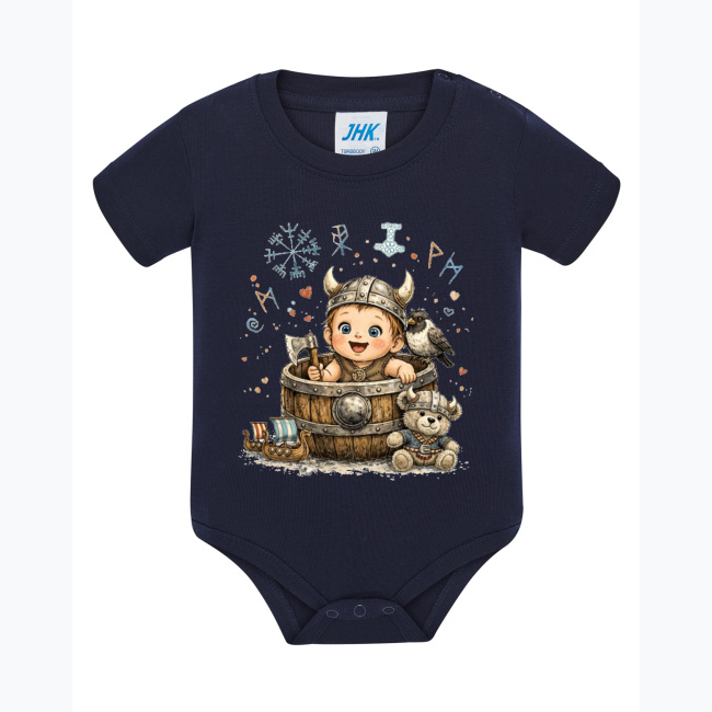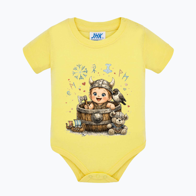 Urocza ilustracja w stylu nordyckim przedstawia małego Wikinga pełnego radości i dziecięcej energii. Maluch siedzi w drewnianej beczce niczym w miniaturowej łodzi, trzymając maleńki toporek, a obok niego czuwa wierny ptasi towarzysz oraz pluszowy miś w wikińskim stroju. Całość otaczają runy i delikatne ozdobne elementy, nadające grafice magiczny, przygodowy klimat.To słodki i wyjątkowy wzór dla…