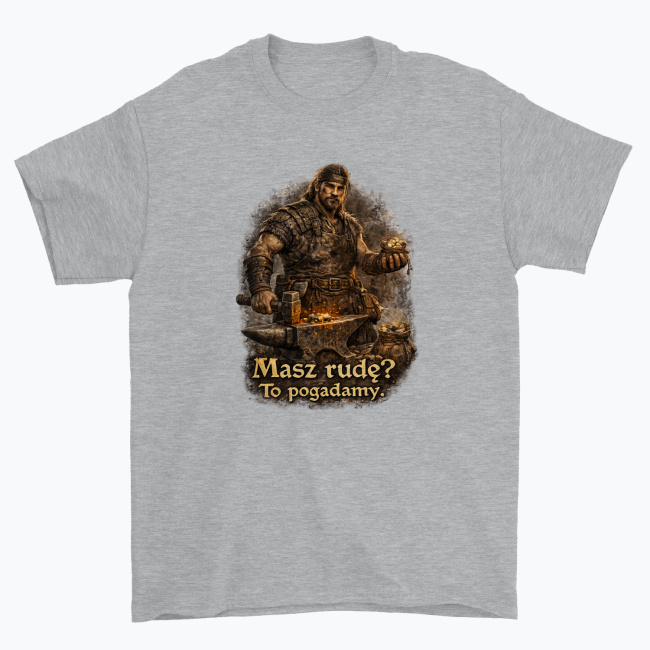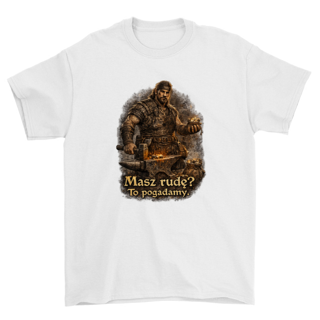 Klimatyczna koszulka inspirowana mrocznym, surowym światem znanym z kultowych gier RPG. Grafika przedstawia twardego kowala z górniczej kolonii – faceta, który nie traci czasu na gadki i od razu wie, czy masz coś wartościowego.  „Masz rudę? To pogadamy.” – tekst idealnie oddaje atmosferę ciężkiej roboty, brudnych kuźni i handlu, gdzie wszystko kręci się wokół rudy. …