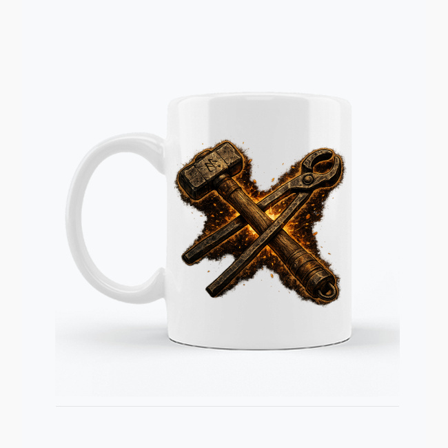 Minimalistyczny, rysowany motyw przedstawiający skrzyżowane narzędzia kowala — młotek i kleszcze. Idealny wybór dla każdego kowala, majsterkowicza i fana rzemiosła, który lubi wyrazić swoją pasję w prosty, symboliczny sposób. Szczegóły produktu: Pojemność: 325 ml Wysokość: 95 mm Średnica: 82 mm Pole zadruku: 72×85 mm (przód/tył) Kubek wykonany metodą sublimacji Produkt certyfikowany jako bezpieczny do spożycia…