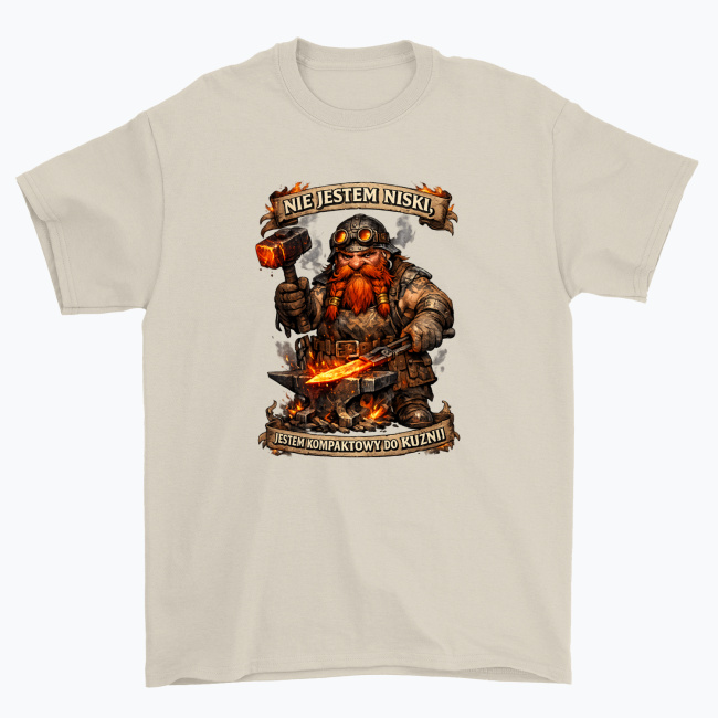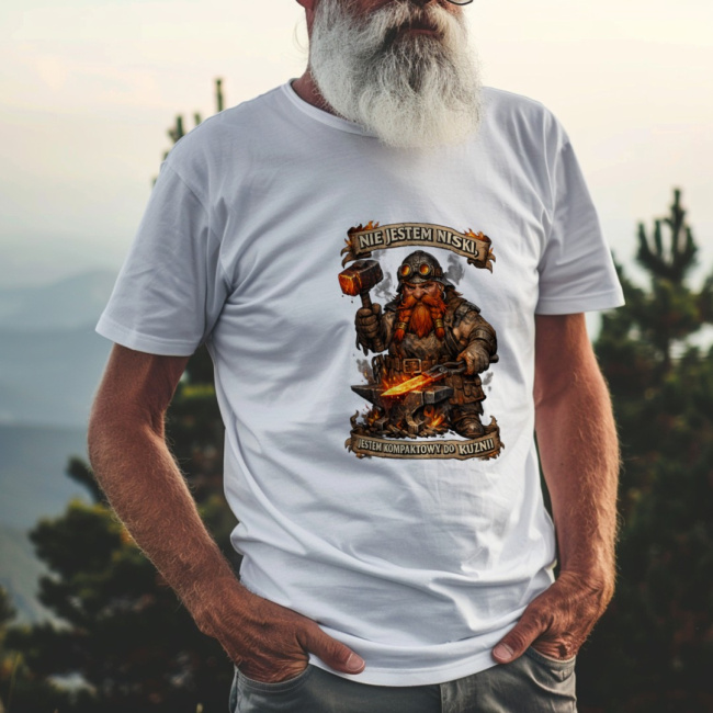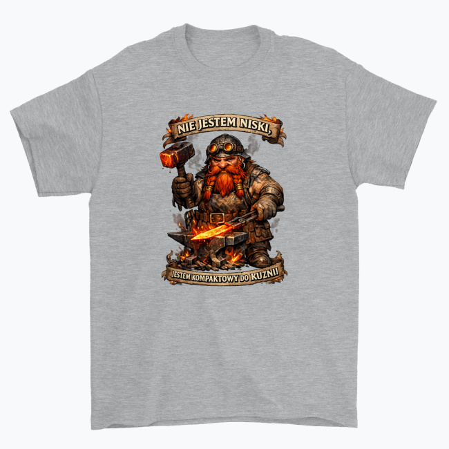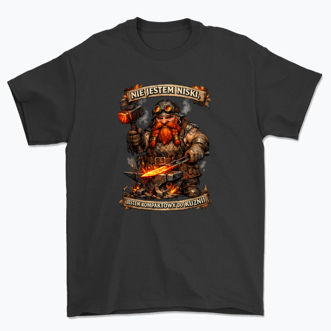Ta koszulka to idealny wybór dla każdego, kto czuje w sercu odrobinę krasnoludzkiej siły, humoru i… umiłowania do dobrego młota! Grafika przedstawia charakternego krasnoluda–kowala przy pracy, otoczonego iskrami i żarem kuźni, a całość uzupełnia zabawny tekst „Nie jestem niski, jestem kompaktowy do kuźni!”.