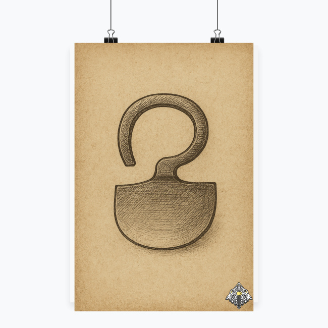 Plakat przedstawia ręcznie szkicowany nóż kabłączkowy o nietypotym kształcie – narzędzie o charakterystycznym, zamkniętym uchwycie i krótkim, zakrzywionym ostrzu. Styl ilustracji nawiązuje do dawnych rycin technicznych i rzemieślniczych szkiców z epoki przedprzemysłowej – jakby pochodził z notatnika snycerza, garbarza lub kowala. Na tle postarzanego papieru w odcieniach sepii widnieje wyraźna linia tuszu, z delikatnym cieniowaniem…