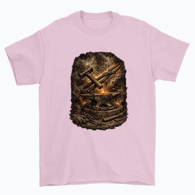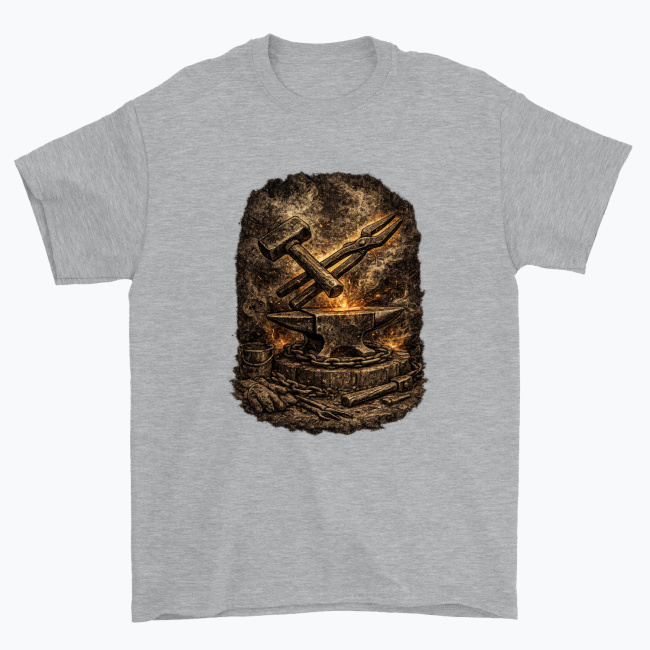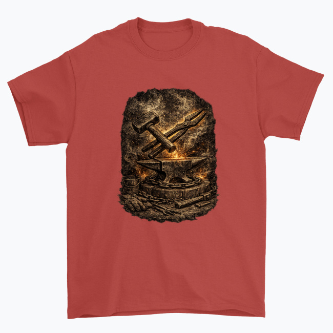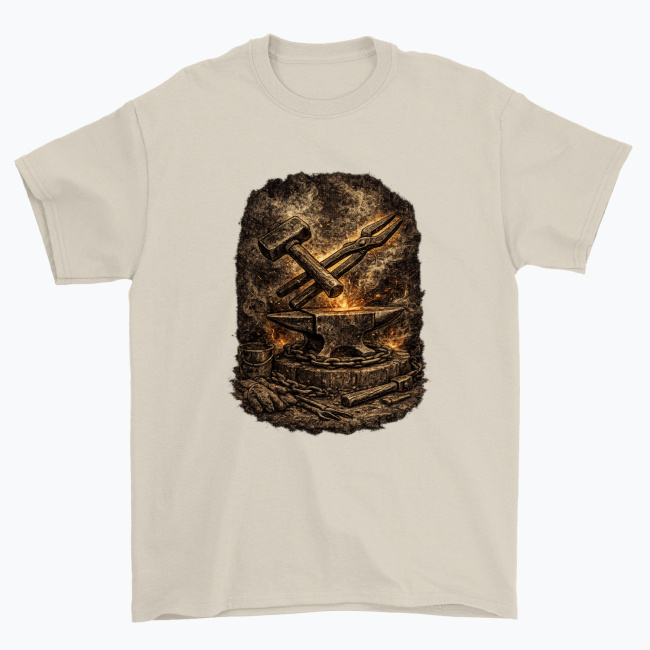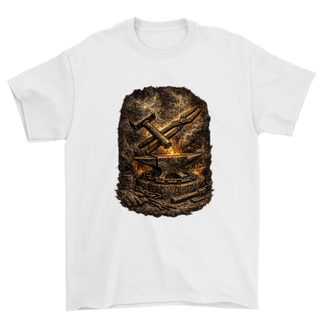Surowy, klimatyczny motyw kowalski przedstawiający klasyczne narzędzia: młot, kowadło i szczypce, otoczone żarem oraz teksturą przypominającą dawną kuźnię. Grafika oddaje klimat ciężkiej pracy, stali i ognia, dzięki czemu świetnie sprawdza się na koszulkach, bluzach, kubkach i innych gadżetach.