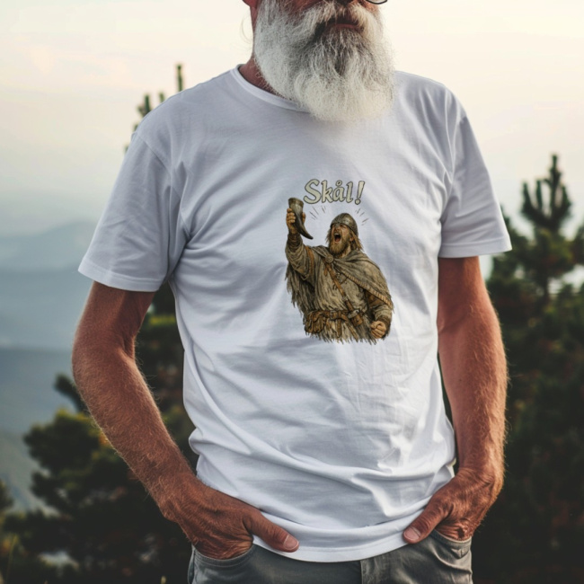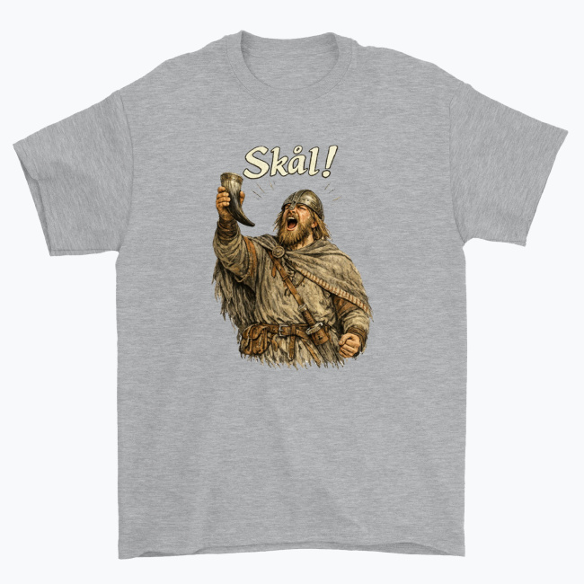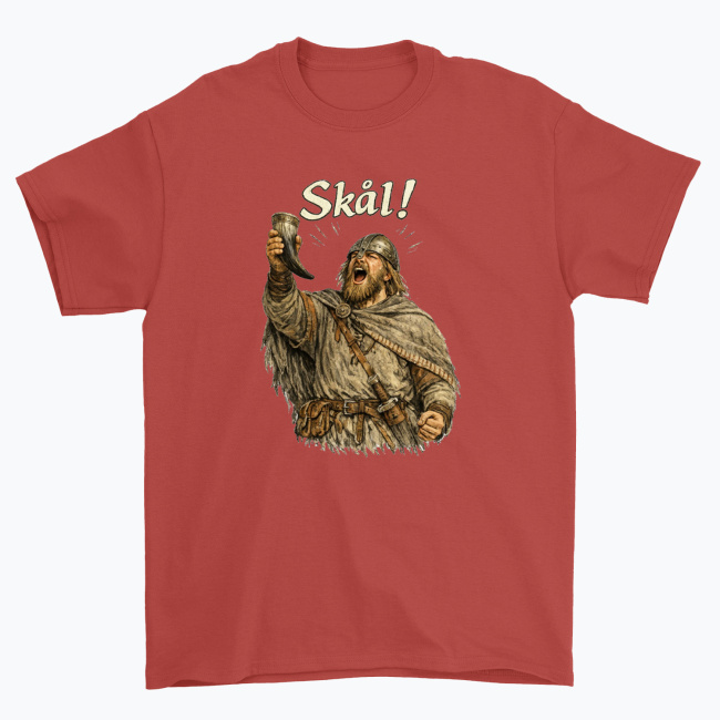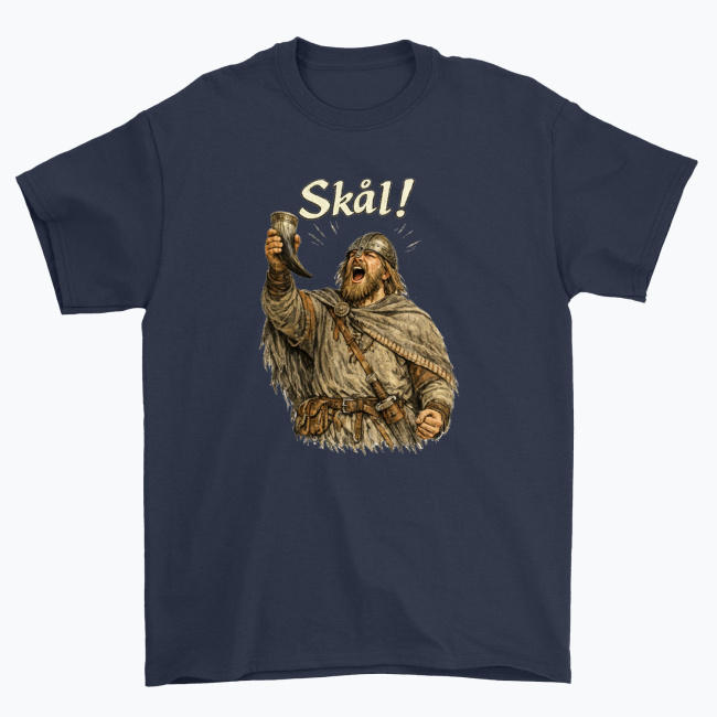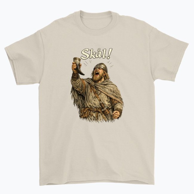 Realistyczna ilustracja inspirowana historycznymi rycinami i rekonstrukcjami przedstawia wikinga unoszącego róg i wykrzykującego „Skål!”. Detale stroju, uzbrojenia i wykończenia oddają surowy, autentyczny charakter epoki, tworząc mocny i wyrazisty motyw w duchu północnych kultur.